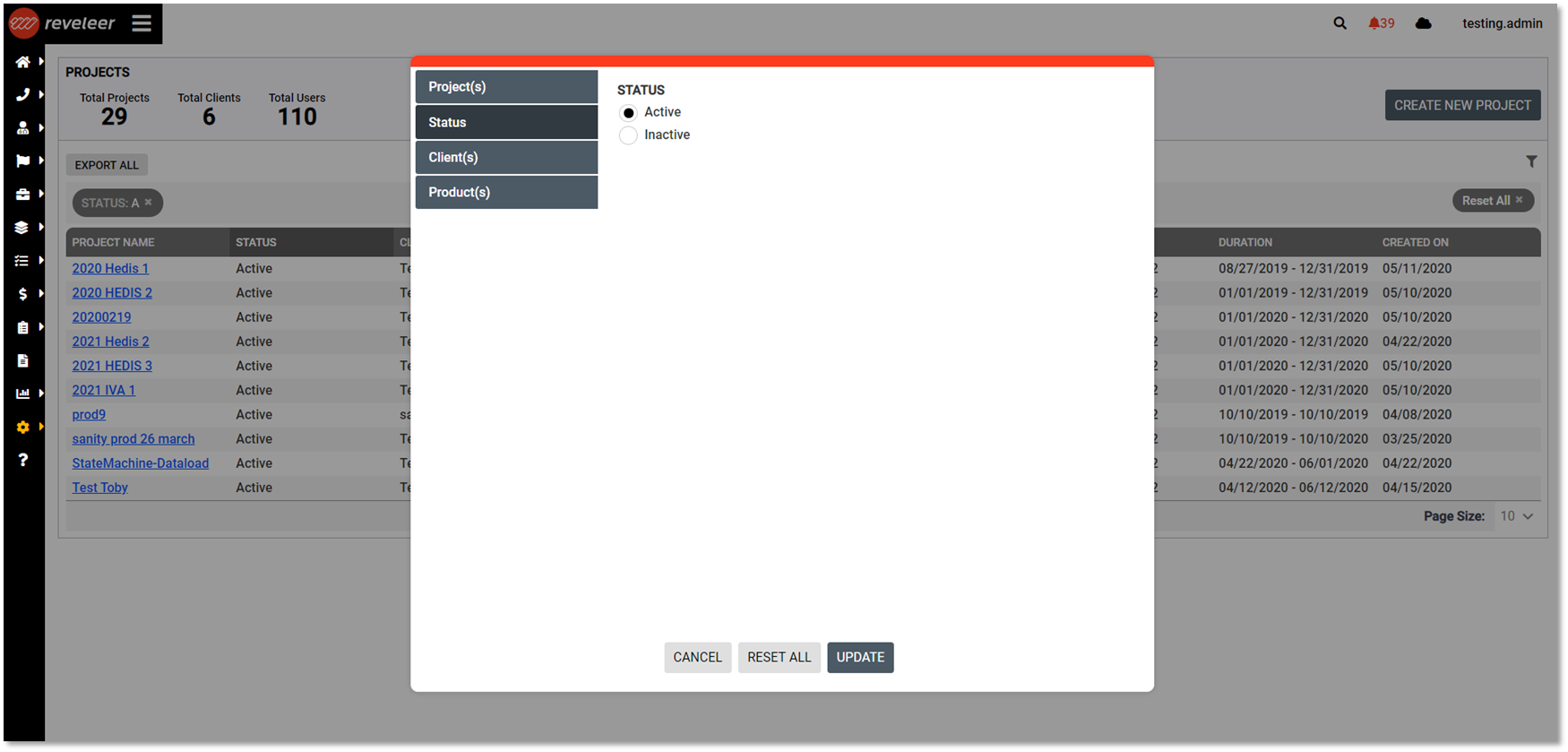 In association with the Inactive/Active project status toggle, we are now allowing users to view and filter projects by their status.