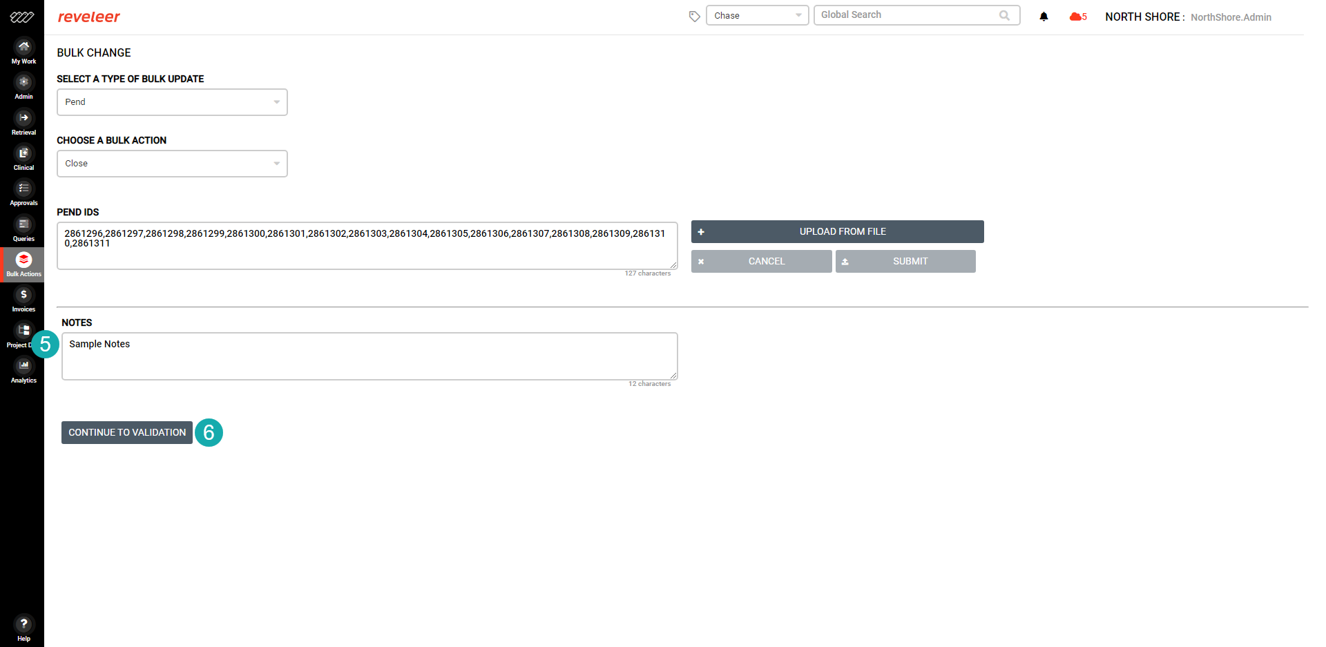 Change Pends Elissa Toder Modified on: Mon, 20 Dec, 2021 at 1:52 PM TABLE OF CONTENTSChange PendsResolve PendsClose PendChange Owner: Reveleer to ClientChange Owner: Client to ReveleerUpdate 3rd Party FieldsChange PendsResolve PendsFrom Bulk Update, select PendSelect Bulk Action: ResolveEnter or upload Pend Chase ID listClick ContinueEnter NotesClick Continue to ValidationTo finalize, click Finish Bulk Update Close PendFrom Bulk Update, select PendSelect Bulk Action: CloseEnter or upload Pend Chase ID listClick ContinueEnter NotesClick Continue to ValidationTo finalize, click Finish Bulk Update Change Owner: Reveleer to ClientFrom Bulk Update, select PendSelect Bulk Action: Change Owner: Reveleer to ClientEnter or upload Pend Chase ID listClick ContinueEnter NotesClick Continue to ValidationTo finalize, click Finish Bulk Update Change Owner: Client to ReveleerFrom Bulk Update, select PendSelect Bulk Action: Change Owner: Client to ReveleerEnter or upload Pend Chase ID listClick ContinueEnter NotesClick Continue to ValidationTo finalize, click Finish Bulk Update Update 3rd Party FieldsFrom Bulk Update, select PendSelect Bulk Action: Update 3rd Party FieldsEnter or upload Pend Chase ID listClick ContinueEnter NotesEnter Invoice NumberEnter Invoice AmountSelect CompanyClick Continue to ValidationTo finalize, click Finish Bulk Update